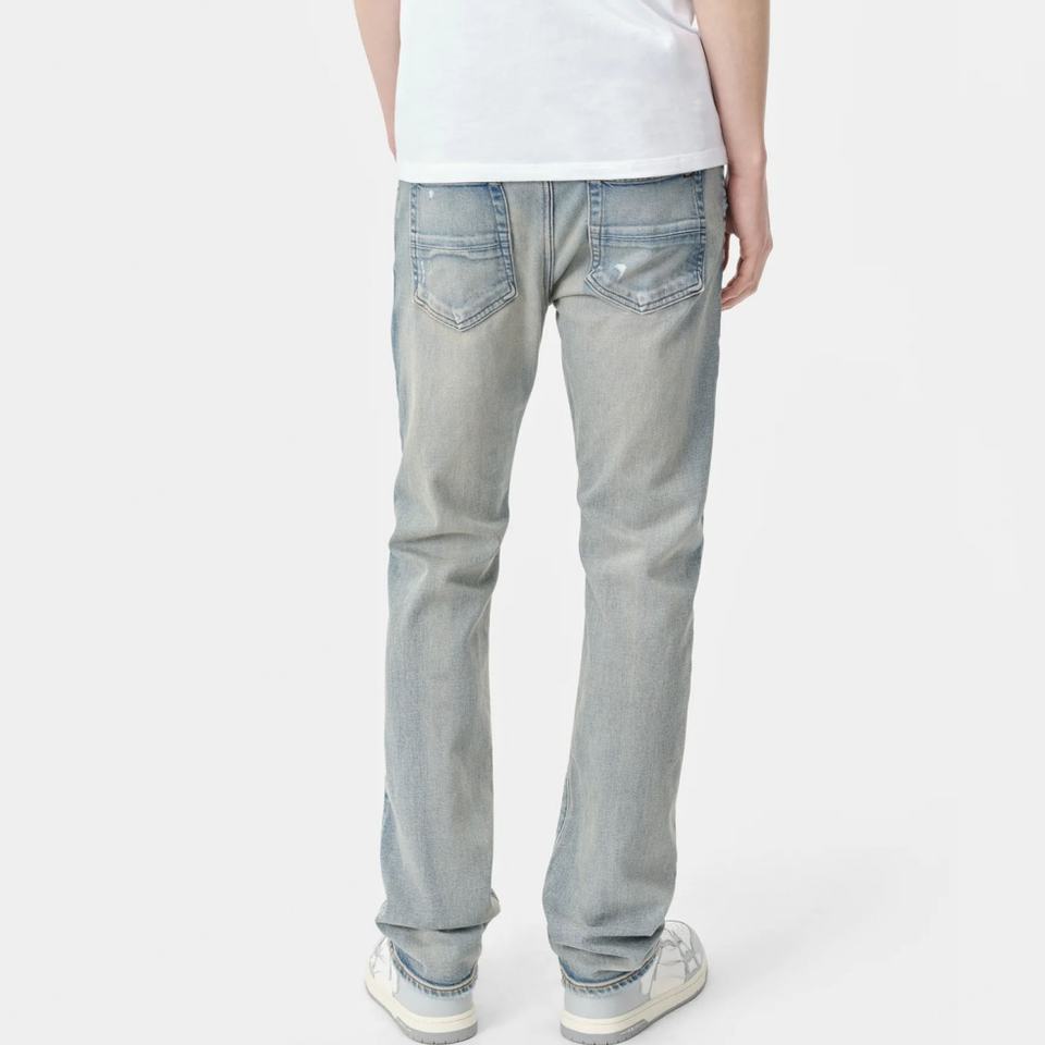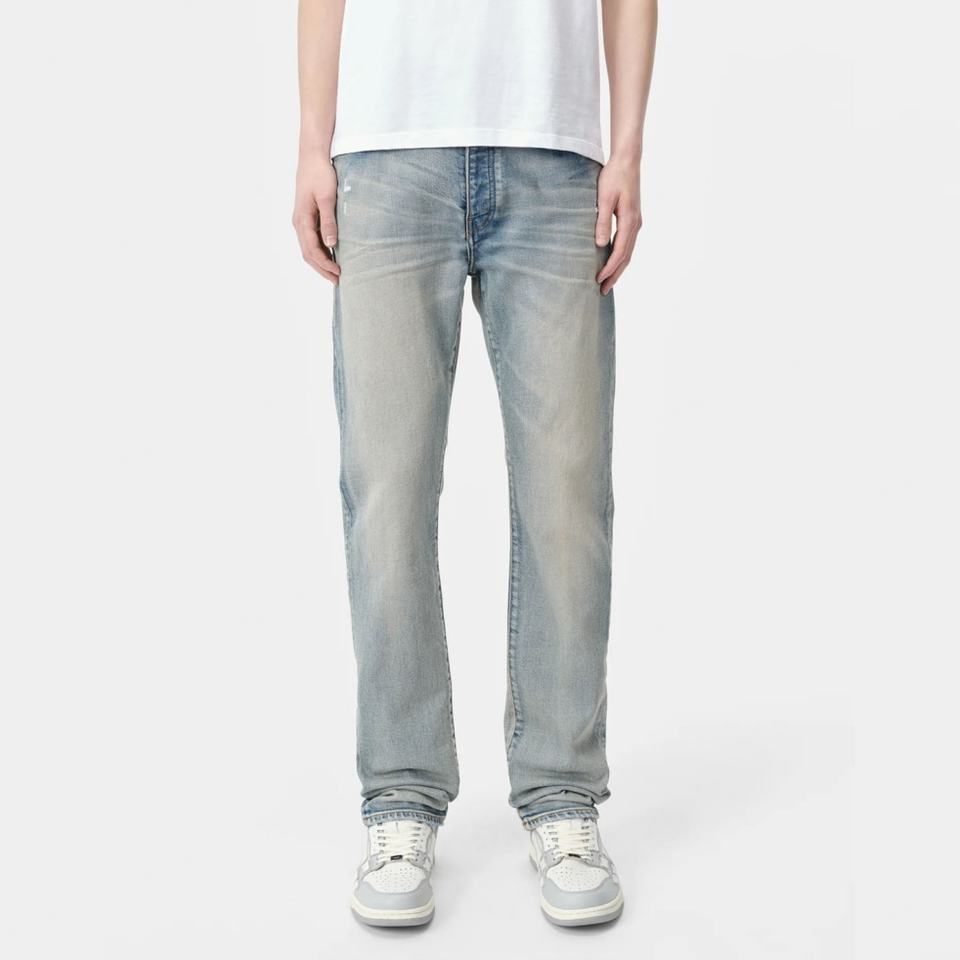 กางเกงยีนส์เดนิมผู้ชายทรงสลิมวินเทจสีน้ำเงินฟอกแบบทำลายพิเศษ ดีไซน์แฟชั่น เอวกลาง ระบายอากาศได้ดี สวมใส่สบาย