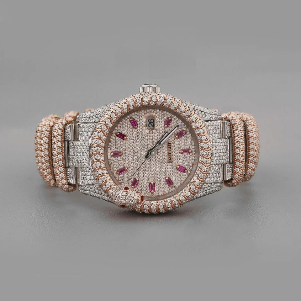 นาฬิกาเพชรสำหรับผู้ชายหน้าปัดกลมสีโรสโกลด์แบบสายคาดแต่งด้วยลายงูเพ็ทฮอร์นสำหรับปลูกในแล็บ