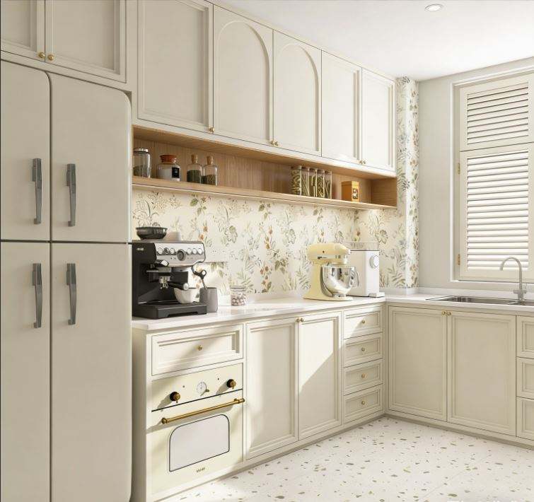 ชุดตู้ครัวไม้เนื้อแข็งสั่งทำพิเศษ พร้อมแผงประตูแกะสลัก ชั้นวางปรับระดับได้ และชั้นวางเครื่องปรุงแบบดึงออกได้ สำหรับครัวในบ้านพักตากอากาศ