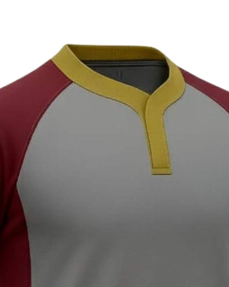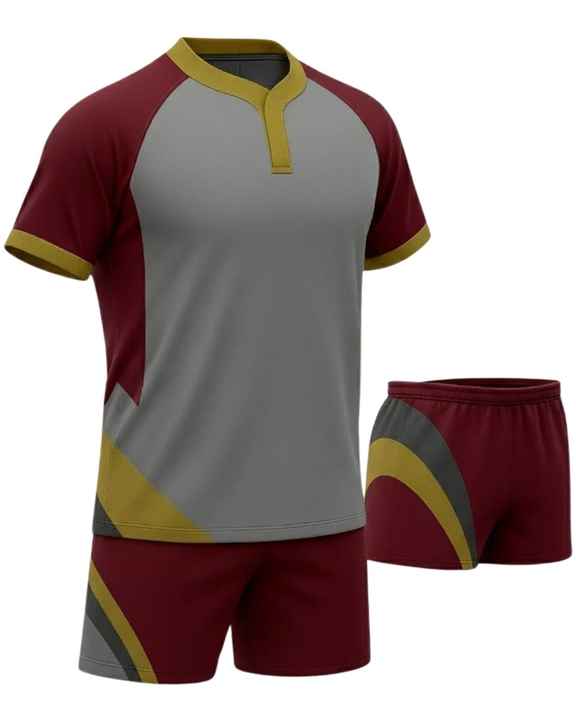 ชุดกีฬาเสื้อและกางเกงขาสั้นแบบกำหนดเอง สีแดงอมน้ำตาล เทา ทอง โพลีเอสเตอร์ พิมพ์ลายแบบซับลิเมชั่น ชุดทีมสำหรับผู้ชาย ชุดฝึกซ้อม