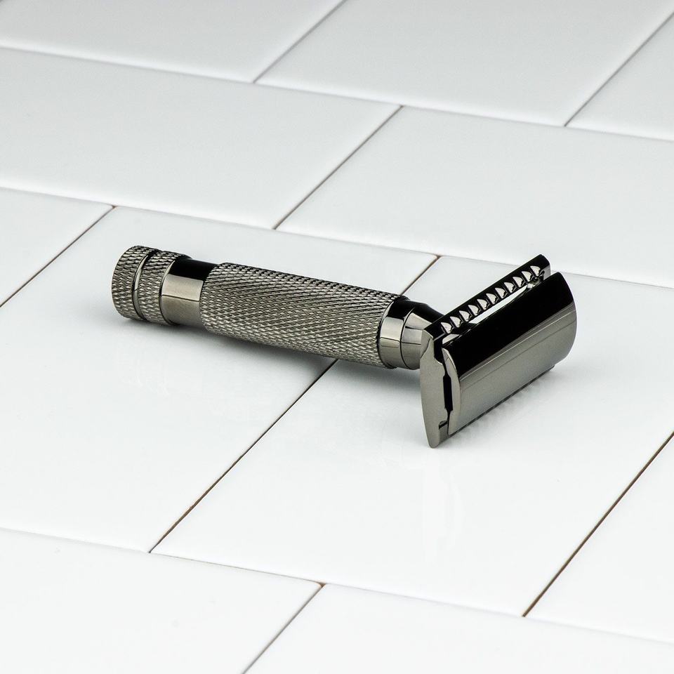 เครื่องโกนหนวดสแตนเลสแบบแมนนวลขอบคู่ที่กำหนดเองด้ามจับกันลื่นเครื่องโกนหนวดแบบคลาสสิกสำหรับใบหน้าและเส้นผมของผู้ชาย