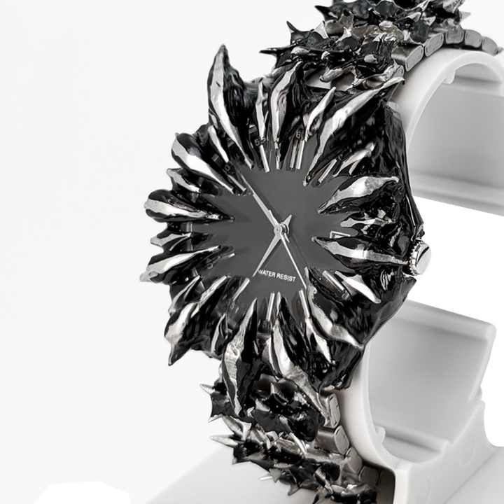 นาฬิกาข้อมือสแตนเลสสตีลแบบกำหนดเองสำหรับผู้ชาย ตัวเรือนทรงแปลกตาแบบมีหนาม สไตล์ดาร์กไพโอเนียร์ ไซเบอร์กอธ ดีไซน์ใบมีดคมกริบ