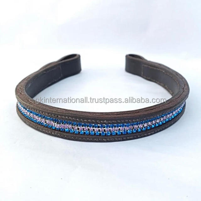 ที่กำหนดเองทรงตรงแถบคิ้วหนังม้าแผ่นรองคิ้วคริสตัลสีฟ้าและสีชมพูฝังพลอยเทียมเป็นประกายวิบวับ