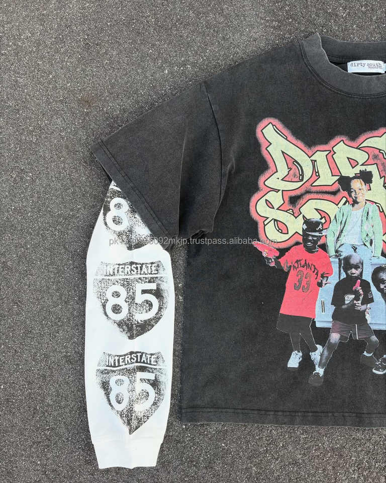 เสื้อยืดแขนยาวคอกลมสองชั้นขึ้นลงที่แผงเสื้อผ้าแนวสตรีทพิมพ์ลายทรงโอเวอร์ไซส์
