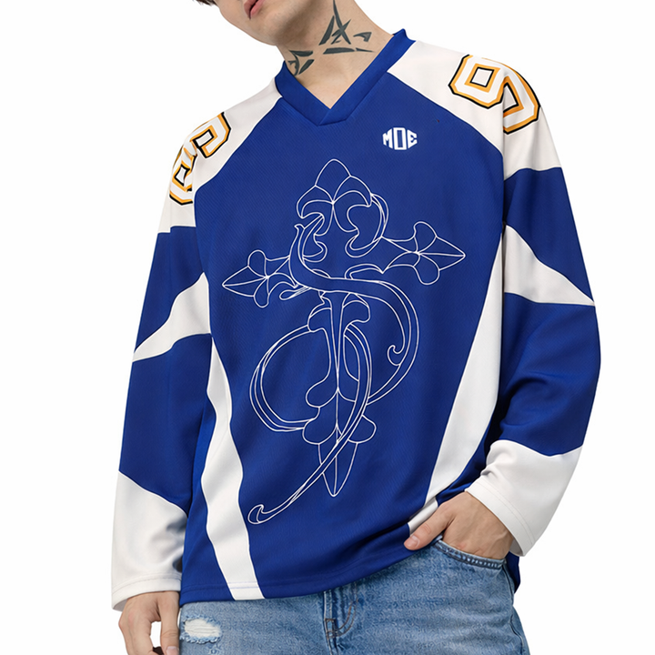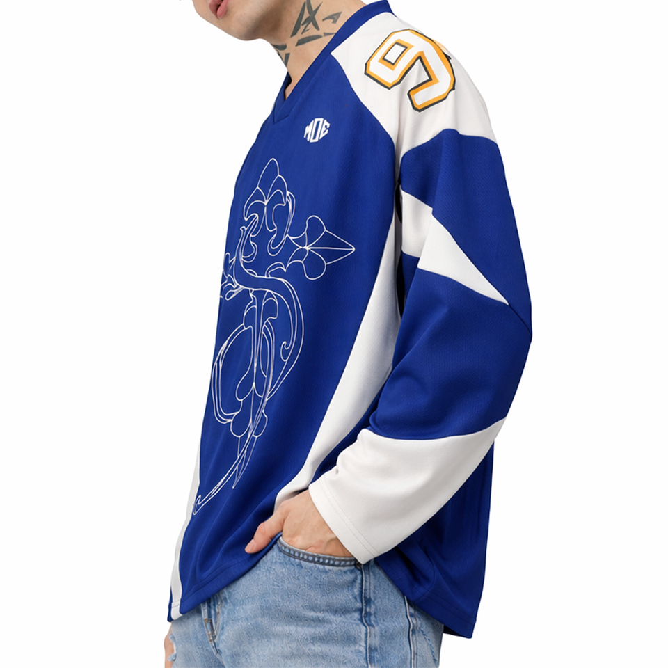 เสื้อฟุตบอลอเมริกันสีน้ำเงินแบบซับลิเมชั่นสั่งทำพิเศษ แขนยาว 230 GSM โพลีเอสเตอร์ สไตล์อเมริกัน ชุดกีฬา ผู้ผลิต OEM จำนวนมาก