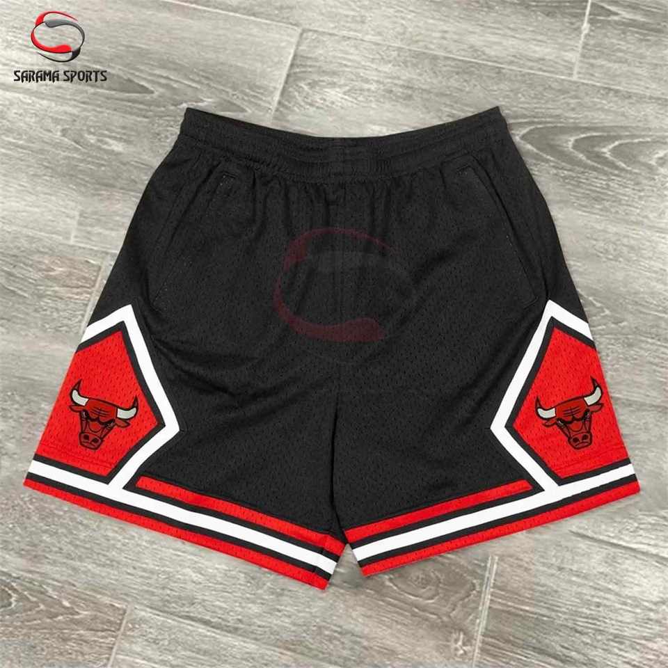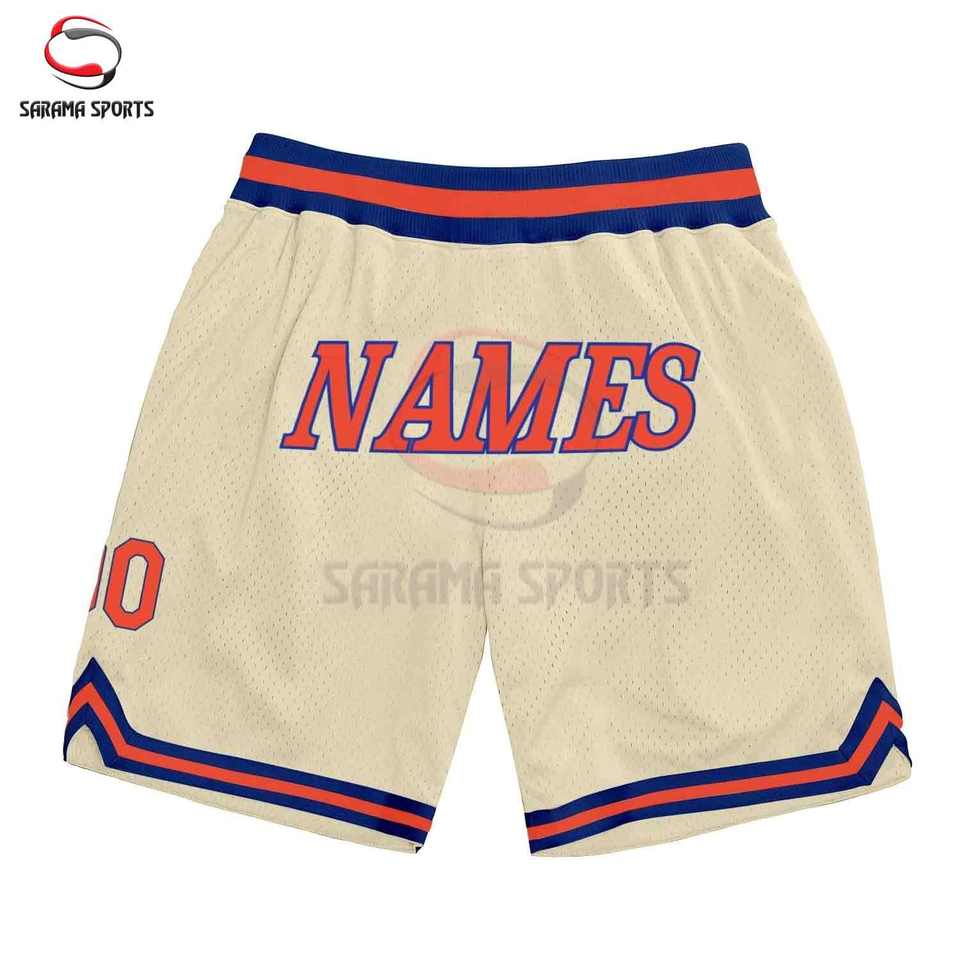 กางเกงบาสเก็ตบอลชายแบบวินเทจปักลายทวิลล์แบบกำหนดเอง ความยาว 5 นิ้ว ผ้าตาข่ายสองชั้น สวมใส่เล่นบาสเก็ตบอลหรือสตรีทแวร์