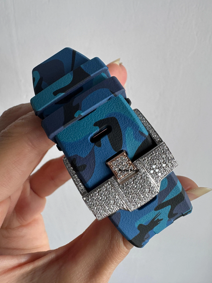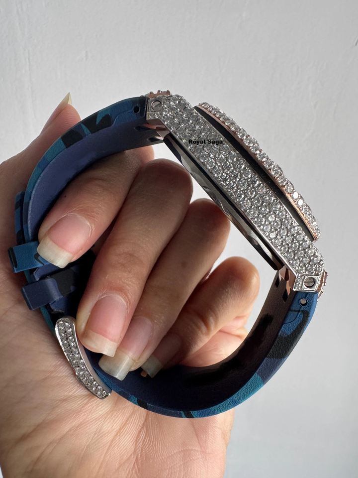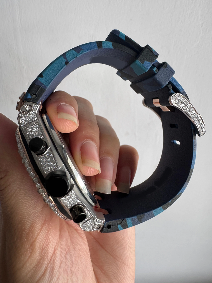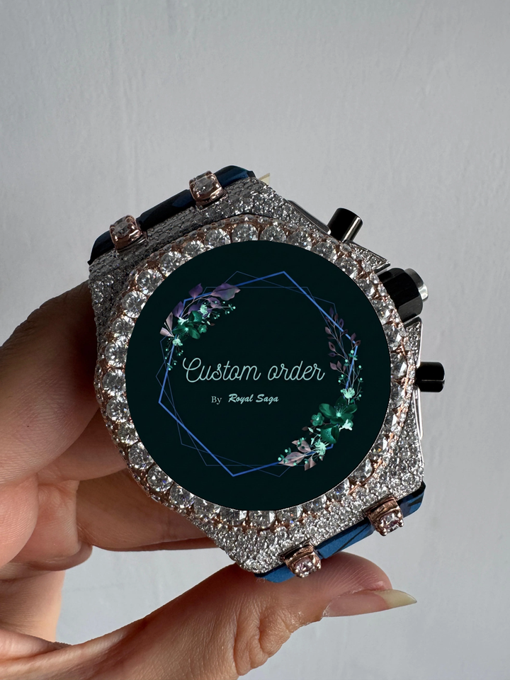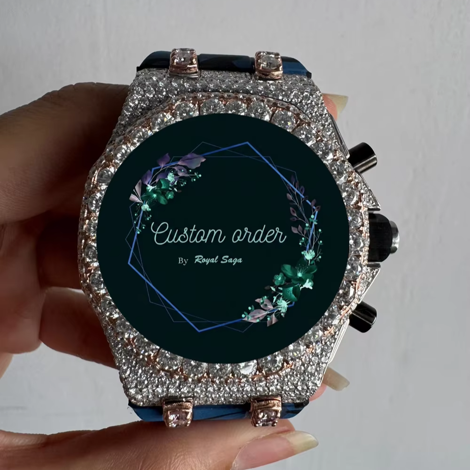 นาฬิกาข้อมือผู้ชายแบบอนาล็อก รุ่นสามโครโนส ประดับเพชรโมอิสซาไนต์ VVS1 ดีไซน์พิเศษ สายยางครึ่งหนึ่งฝังเพชร หรูหรา