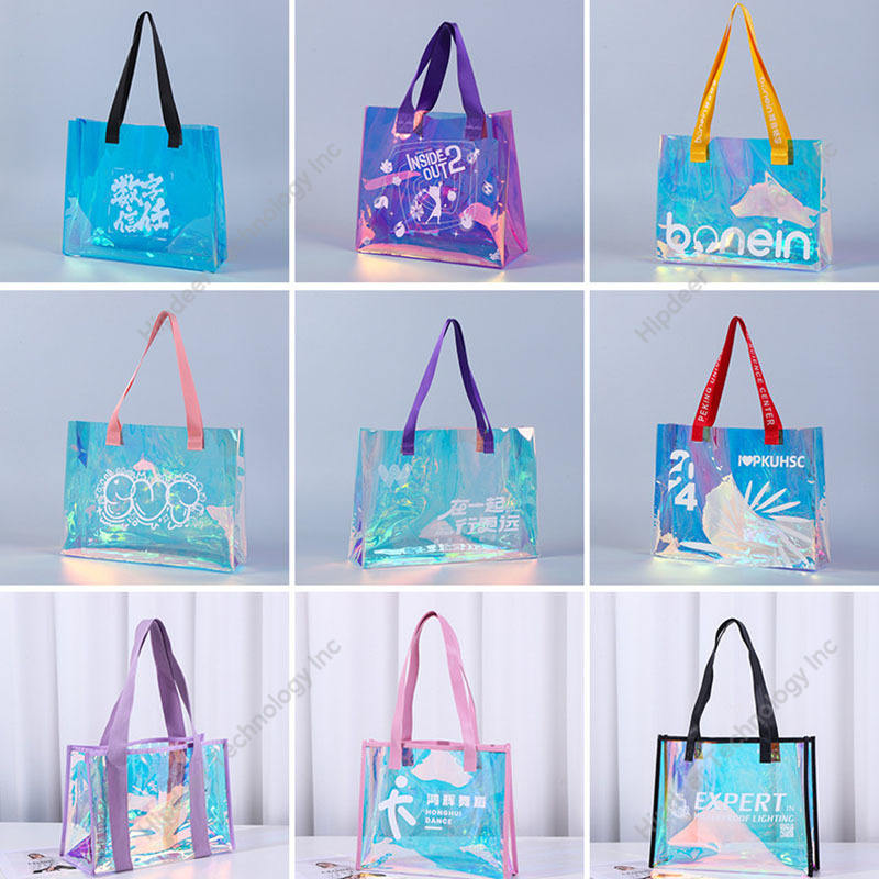 ถุงผ้าพีวีซีใสสำหรับช้อปปิ้งที่กำหนดเองกระเป๋าถือผ้าฝ้ายหนาแฟชั่นกันน้ำโฮโลแกรมใสสำหรับชายหาดสีชมพู