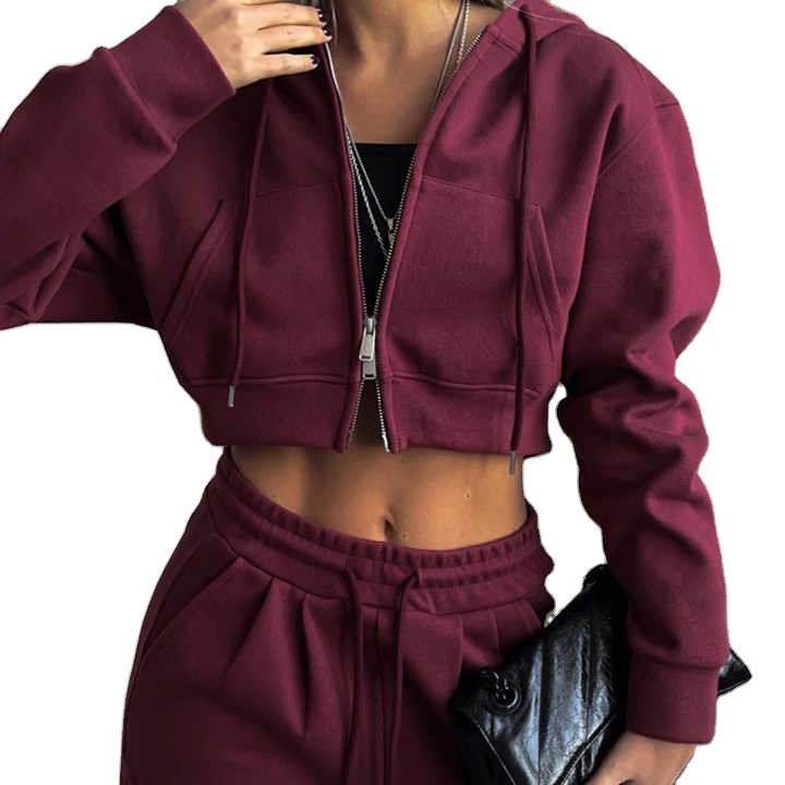 ชุดเสื้อผ้าสองชิ้นแบบมีฮู้ดแขนยาวมีซิปสำหรับผู้หญิงทันสมัย