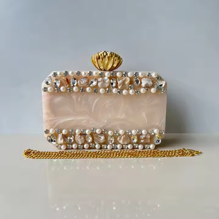 Customized Unique Design Handmade Fashionable Bohemian Resin Clutch Bag Evening Purse with Chains Custom Shape Crescent Crafts