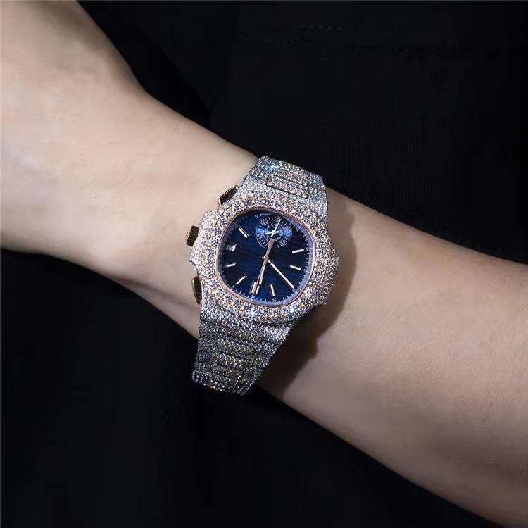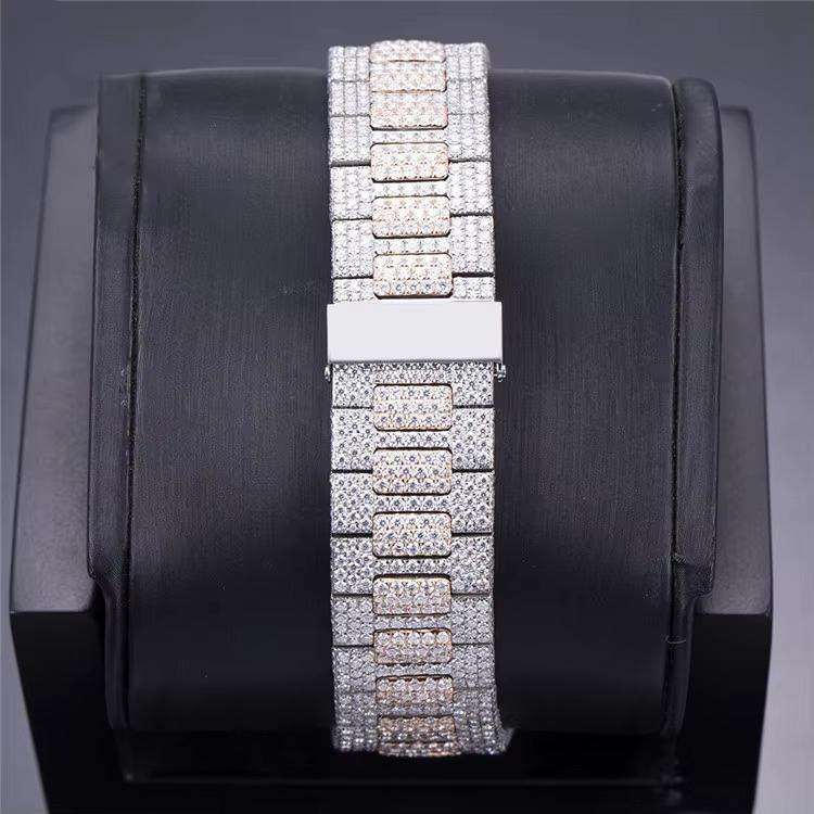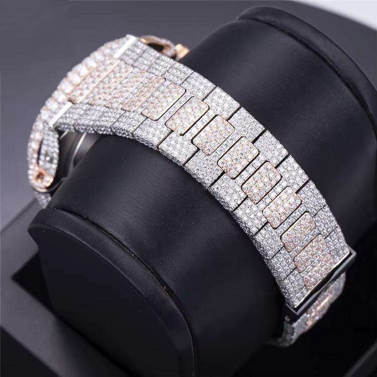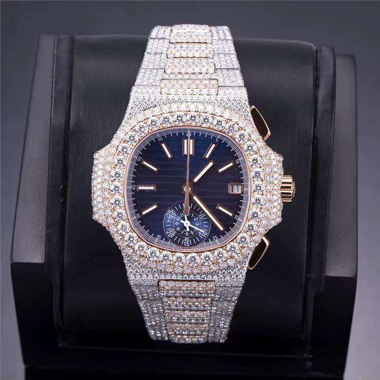 นาฬิกาข้อมือผู้ชายแบบกลไก ETA ประดับเพชรโมอิสซาไนต์ VVS ดีไซน์พิเศษ แฟชั่นฮิปฮอป หรูหรา หน้าปัดอนาล็อก สีทอง/สีเงิน สายเพชรพรีเมียม กันน้ำ 10 บาร์