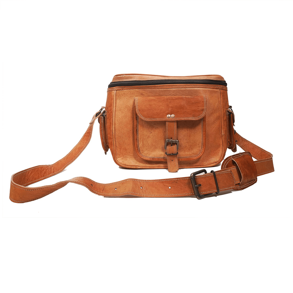กระเป๋ากล้องสำหรับเดินทางแบบสตูดิโอหนังแท้สไตล์วินเทจแบบปรับแต่งได้ทนทานมีฝาปิดและสายคล้องไหล่เดี่ยว
