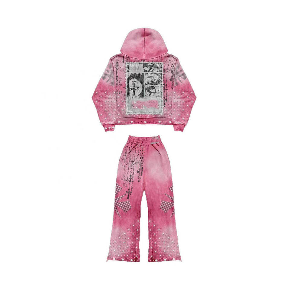 ชุดสองชิ้นวินเทจของผู้ชายชุดเสื้อมีฮู้ดและกางเกงวอร์มพิมพ์ลายหน้าจอพลอยเทียมเต็มรูปแบบสำหรับวิ่งจ็อกเกอร์แอซิดชุดเหงื่อบาน
