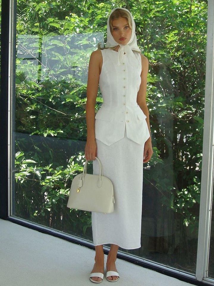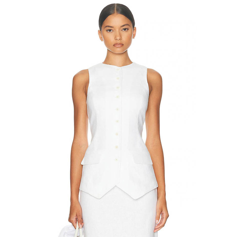 เสื้อกั๊กเอวผ้าลินินแขนกุดคอปกสไตล์วินเทจแบบกำหนดเองเข็มขัดด้านบนมีกระดุมระบายอากาศที่ยั่งยืน