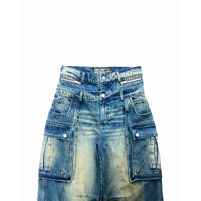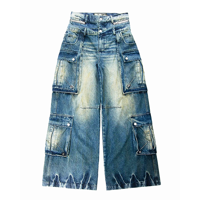 กางเกงยีนส์หลายกระเป๋าทรงหลวมสำหรับผู้ชายกางเกงยีนส์นักขี่จักรยานสไตล์ลำลองย้อนยุคออกแบบได้ตามต้องการ