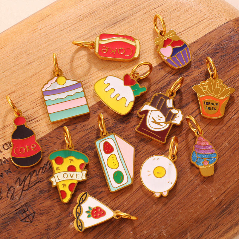 จี้กันน้ำแบบกำหนดเอง ชุบทอง 14k 18k สแตนเลสสตีล 316L เคลือบเงา ลายอาหาร สำหรับทำสร้อยข้อมือ สร้อยคอ เครื่องประดับ