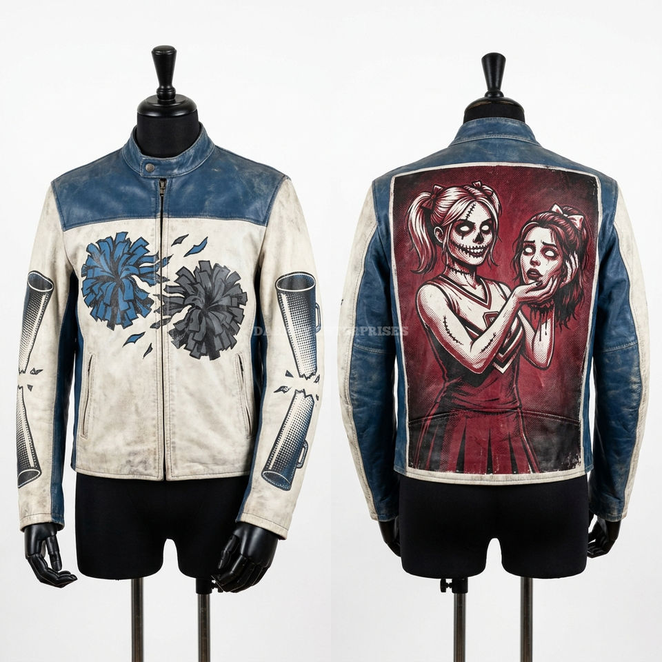 เสื้อแจ็คเก็ตหนังสีขาวแบบสั่งทำพิเศษ ลายกราฟิกเชฟซอมบี้ มีดเปื้อนเลือด แต่งขอบสีแดง เสื้อโค้ทสไตล์ไบค์เกอร์ ผลิตโดยช่างผู้เชี่ยวชาญ