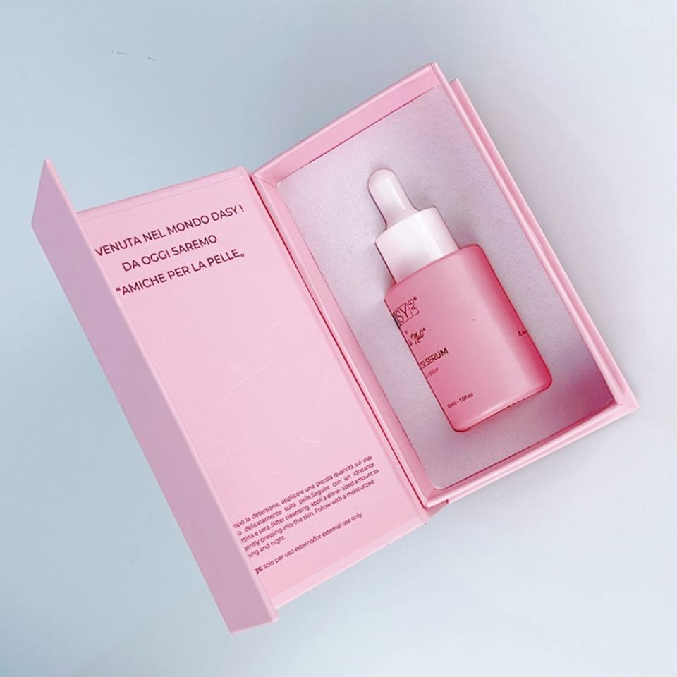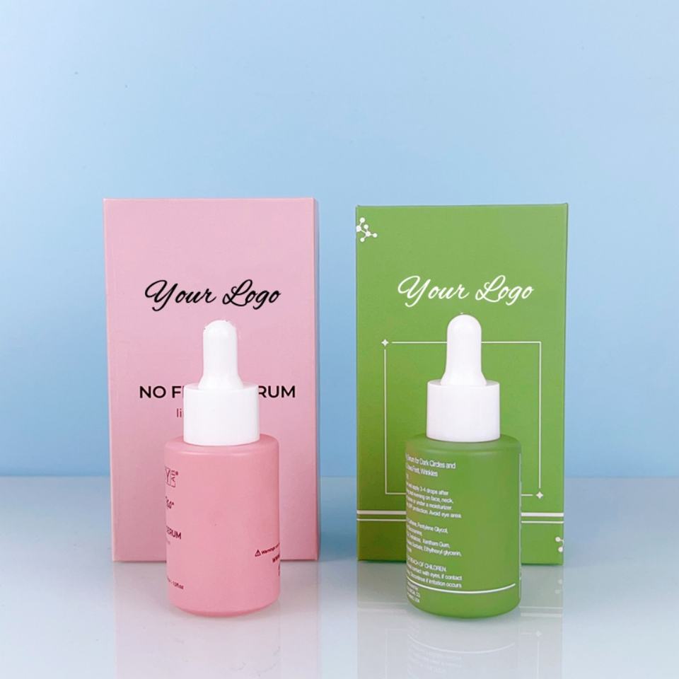 ขวดแก้วหยดสีเขียวด้านขนาด 30 มล. แบบไหล่เรียบ พร้อมกล่องกระดาษแบบกำหนดเอง พิมพ์ลายสกรีนสีขาวตามสั่ง