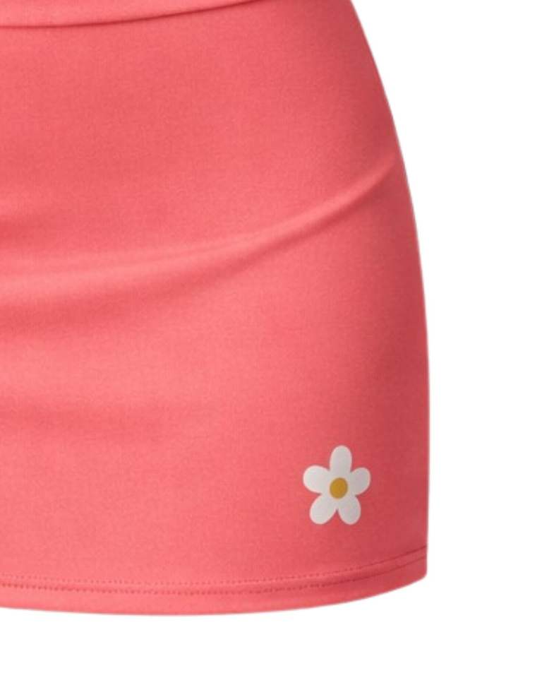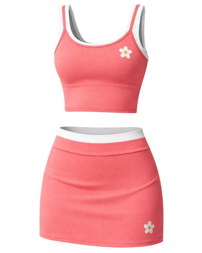 ชุดเซ็ตเสื้อครอปท็อปสีคอรัลและกระโปรงมินิสำหรับผู้หญิง แบบสั่งทำพิเศษ เสื้อชั้นในกีฬาแบบไม่มีแขน ชุดออกกำลังกายโยคะสองชิ้น ชุดลำลองสำหรับฤดูร้อน ชุดฟิตเนส