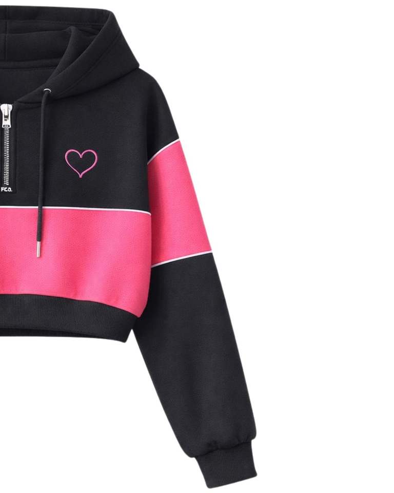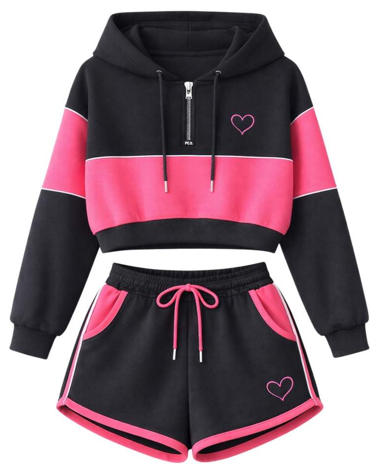 ชุดเซ็ตเสื้อครอปฮู้ดดี้และกางเกงขาสั้นสำหรับผู้หญิง สีดำชมพู แต่งสีบล็อก ซิปหน้า ผ้าโพลีเอสเตอร์ผสมคอตตอน ชุดลำลองสไตล์สปอร์ตสองชิ้น