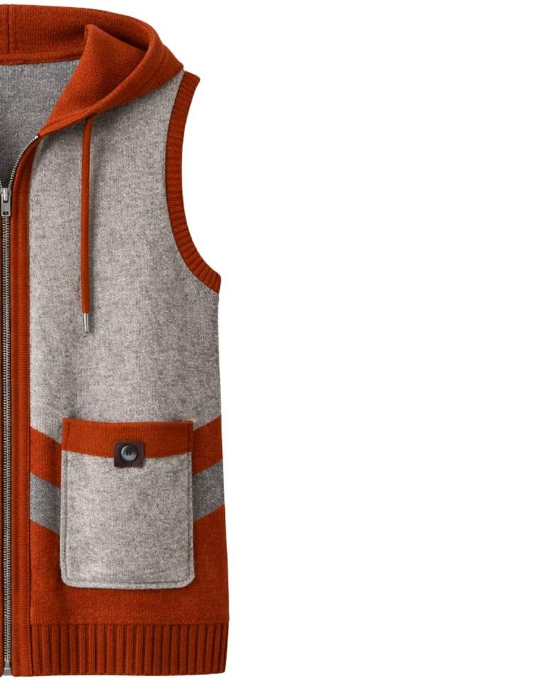 เสื้อกั๊กไหมพรมถักแบบมีฮู้ด สีเทาและสีสนิม สำหรับผู้หญิง แบบสั่งทำพิเศษ ผสมขนสัตว์และอะคริลิก ปิดด้วยซิป สไตล์ลำลองสำหรับฤดูหนาว