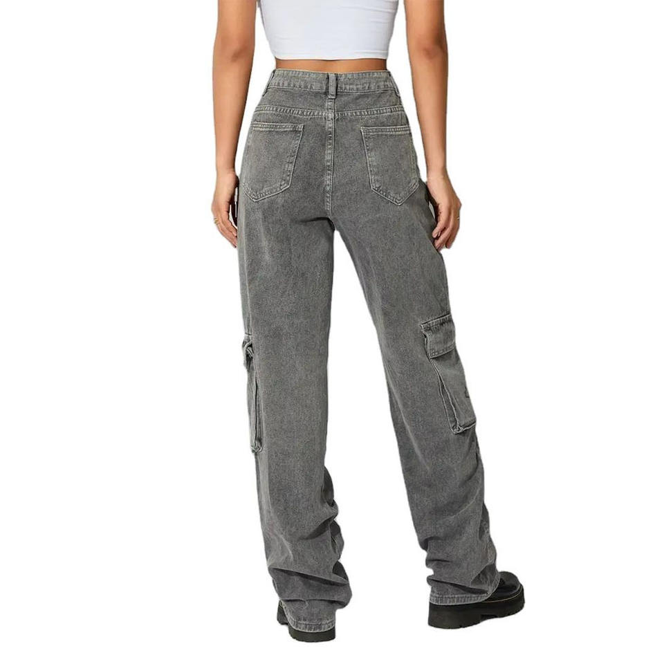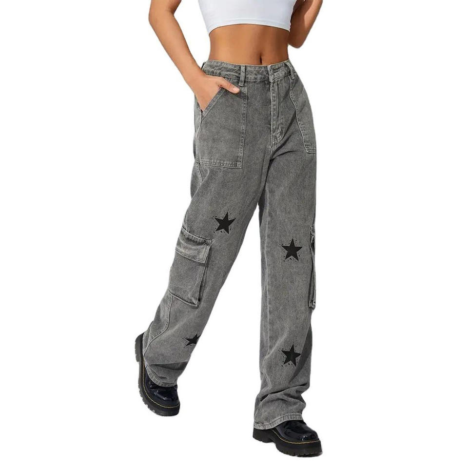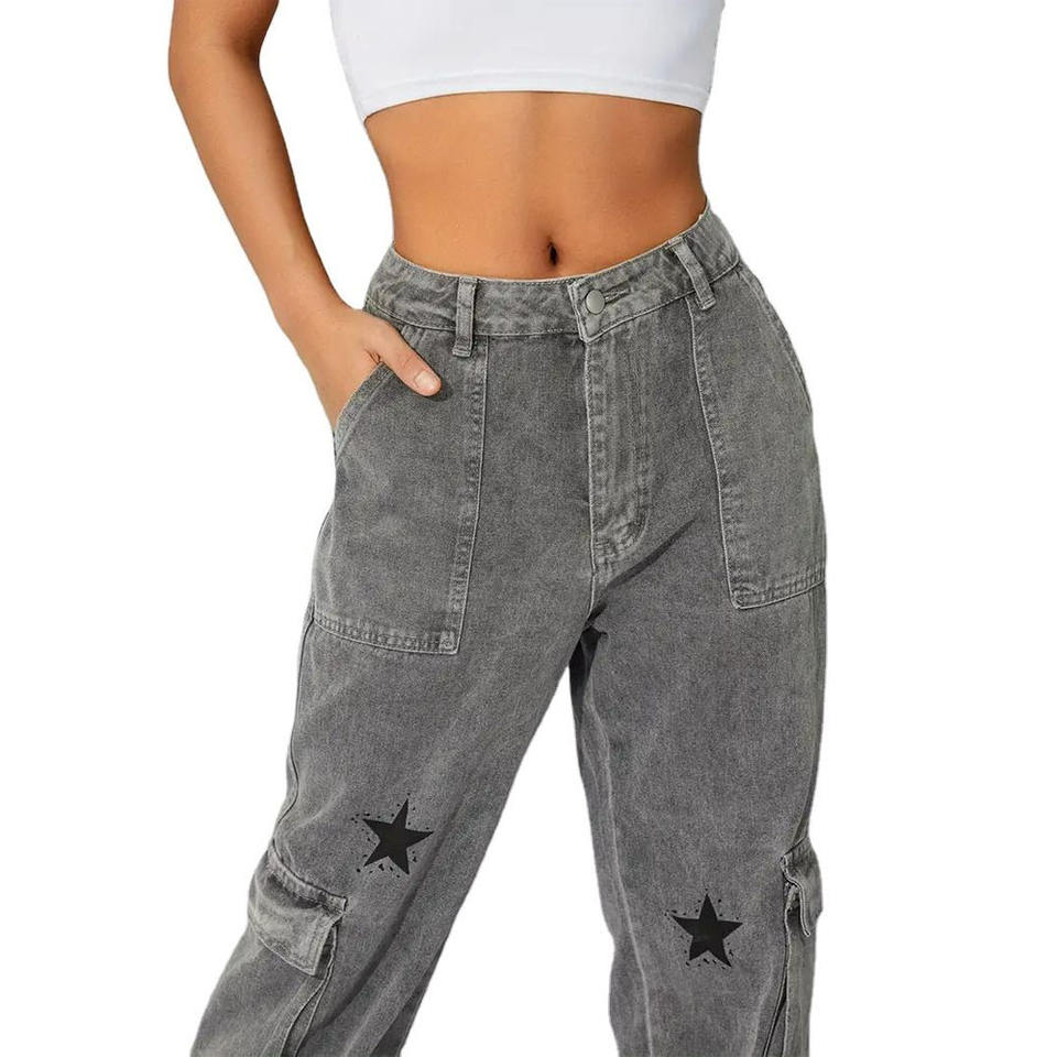 Customized Women Straight Pants Big Pockets Non-stretchy Star Print Street Casual Loose Trousers Jeans