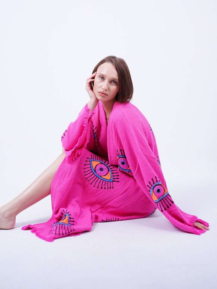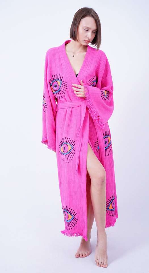 กิโมโนแขนยาวคอวีปักตาชั่วร้ายสำหรับผู้หญิงทำจากผ้าฝ้ายออกแบบได้ตามต้องการดูเป็นธรรมชาติใส่ทำงานลำลองใส่ไปชายหาดด้านหลัง
