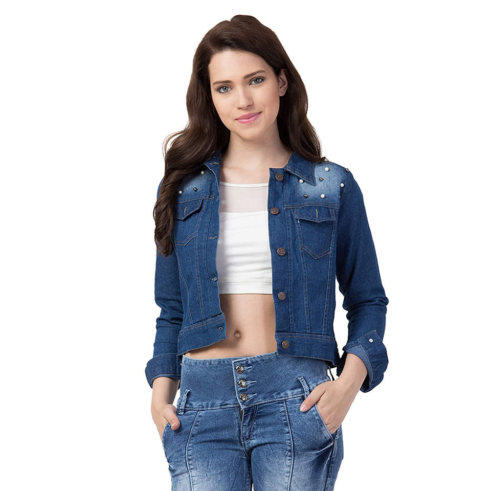 แจ็คเก็ตยีนส์ผู้หญิงแบบสั่งทำพิเศษ แจ็คเก็ตยีนส์แขนยาวสไตล์สตรีทแวร์สำหรับฤดูใบไม้ร่วง ผลิตในปากีสถาน แจ็คเก็ตยีนส์ผู้หญิงระบายอากาศได้ดี