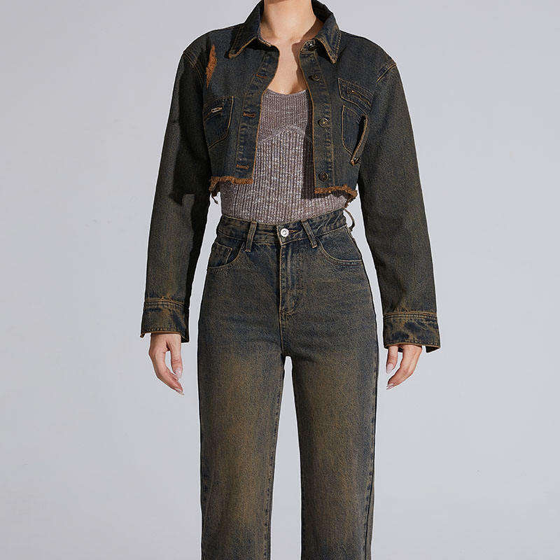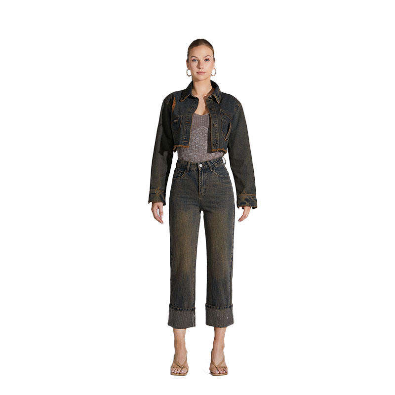 เสื้อและกางเกงผ้ายีนส์ทางการของผู้หญิงชุดสองชิ้นผ้าเดนิมสีเข้มฟอกระบายอากาศได้ดีสำหรับฤดูร้อน