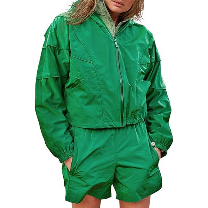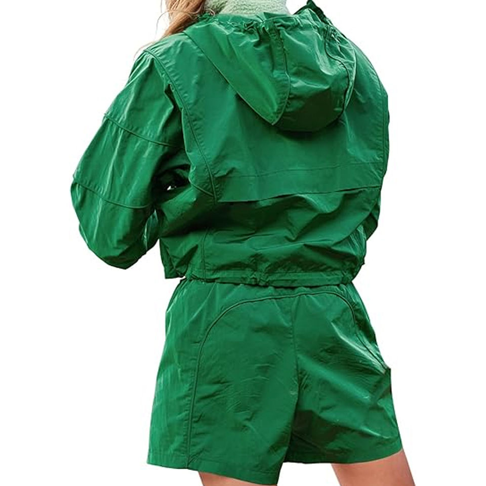 Customized Women's Summer 2-Piece Canvas Windbreaker Shorts Set with Front Pocket Zipper Top Your Own Logo