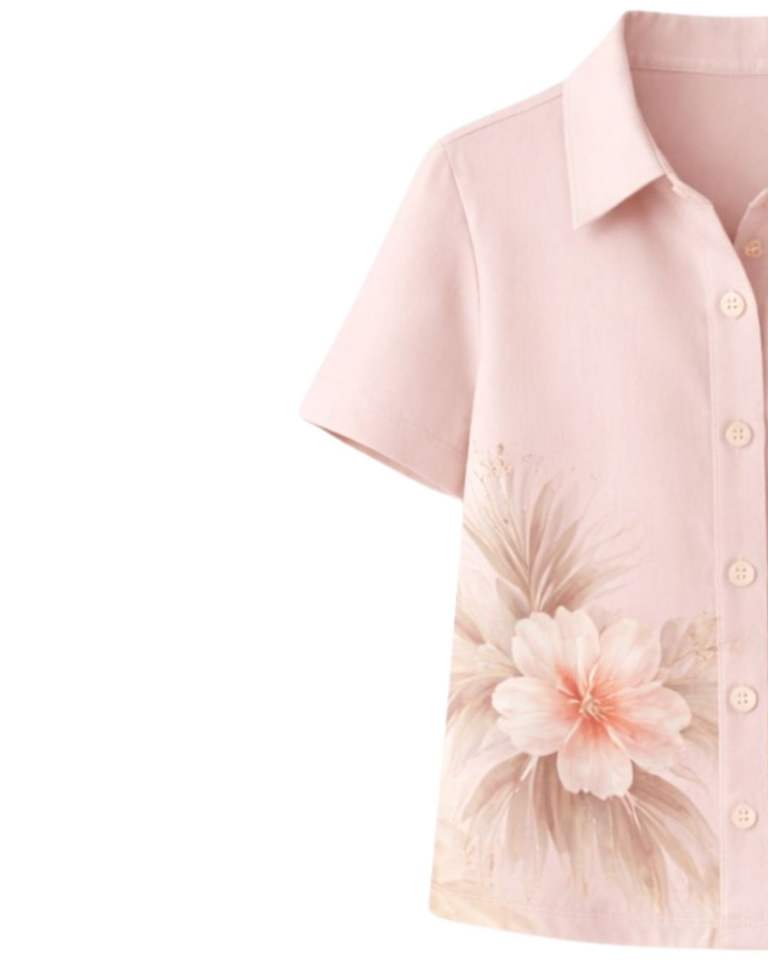ชุดเซ็ตสองชิ้นลายพิมพ์ภูมิทัศน์สีเบจสำหรับผู้หญิง เสื้อเชิ้ตแขนสั้นติดกระดุมพร้อมกางเกงขายาวทรงกว้าง สวมใส่สบายๆ ในฤดูร้อน