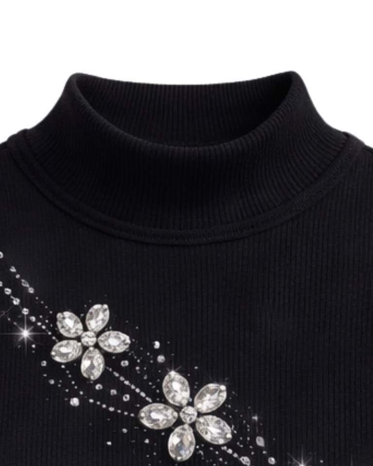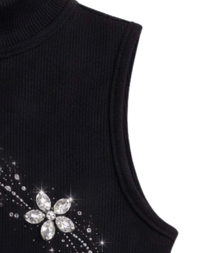 เสื้อกล้ามคอสูงสีดำแบบร่องสำหรับผู้หญิง ตกแต่งด้วยลายดอกไม้ประดับเพชร ไร้แขน เหมาะสำหรับฤดูร้อน ผลิตตามสั่ง