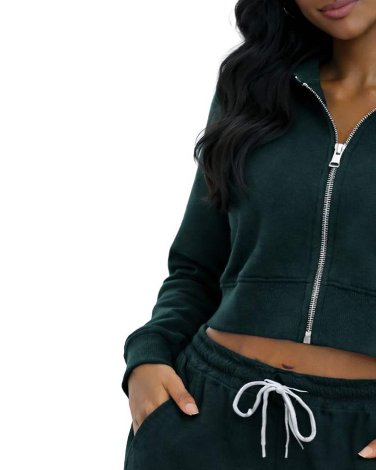 เสื้อฮู้ดครอปซิปสำหรับผู้หญิง สีเขียวเข้ม แขนยาว สไตล์ลำลอง สตรีทแวร์ แจ็คเก็ตออกกำลังกาย