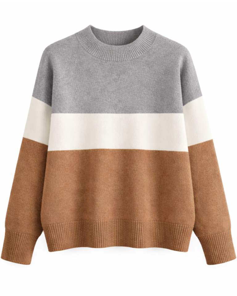 Customized Womens Grey White Brown Colorblock Knit Sweater And Brown Wide Leg Pants Two Piece Casual Winter Outfit Set