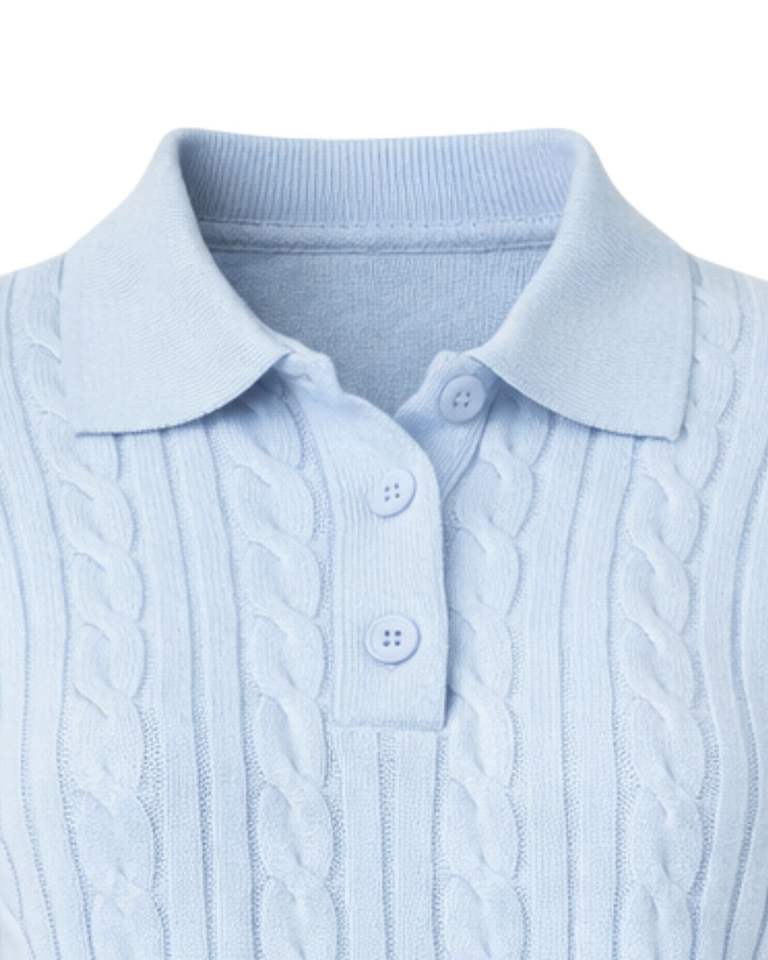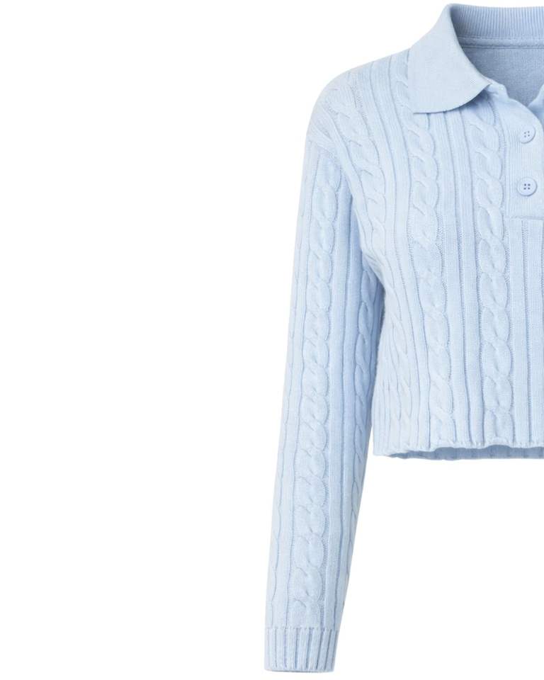 เสื้อโปโลถักไหมพรมสีฟ้าอ่อนแบบครอปสำหรับผู้หญิง แขนยาว ชายเสื้อแบบริบ ติดกระดุม ลำลอง ใส่ได้ในฤดูหนาว