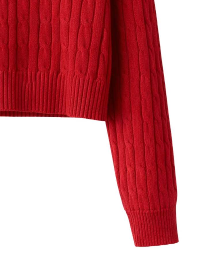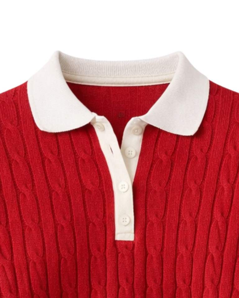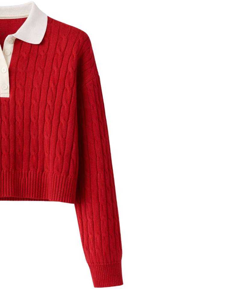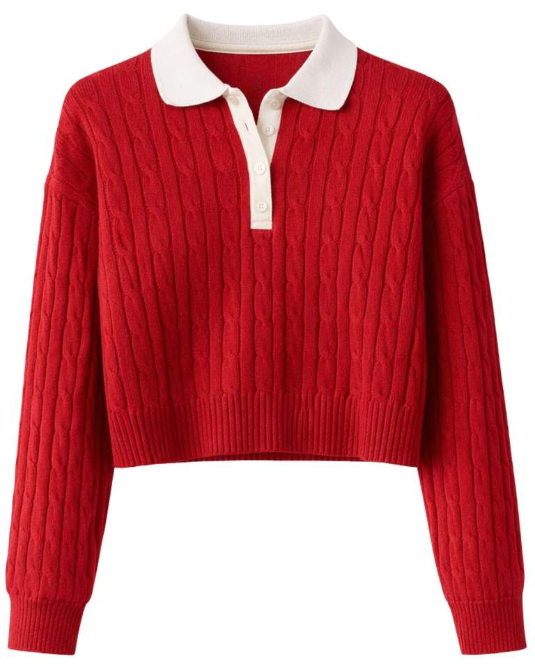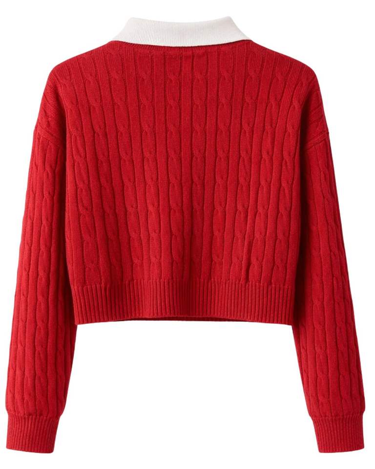 เสื้อโปโลถักไหมพรมสีแดงแบบครอปสำหรับผู้หญิง คอปกสีขาว ติดกระดุม แขนยาว เนื้อผ้านุ่ม สไตล์แฟชั่นฤดูหนาว