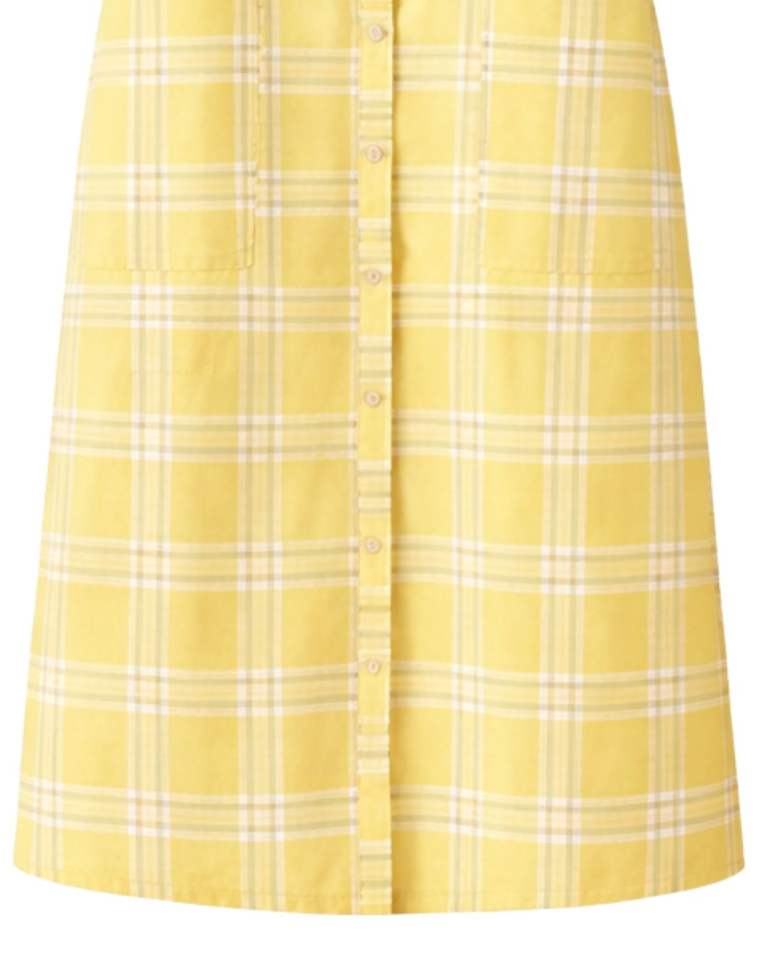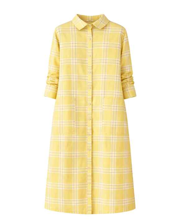 เดรสเชิ้ตยาวลายสก็อตสีเหลืองแบบสั่งทำสำหรับผู้หญิง เดรสลำลองลายตารางปานกลางติดกระดุม รับผลิตตามสั่ง ขายส่งจากโรงงาน
