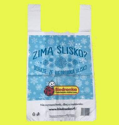 กระเป๋าใส่เสื้อยืดพิมพ์โลโก้สำหรับซูเปอร์มาร์เก็ตบรรจุภัณฑ์พลาสติกออกแบบตามต้องการ
