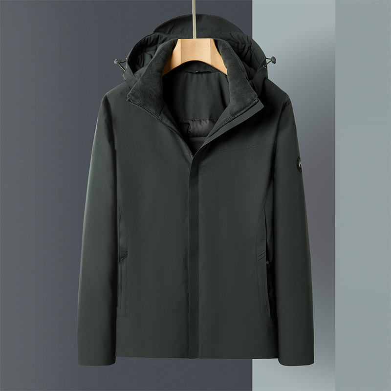 เสื้อแจ็กเก็ตขนเป็ดสำหรับผู้ชายมีฮู้ดหนากันลมแฟชั่นนุ่มอบอุ่นคลาสสิกสีทึบใส่สบายโลโก้ออกแบบได้ตามต้องการสำหรับฤดูใบไม้ร่วงและฤดูหนาว