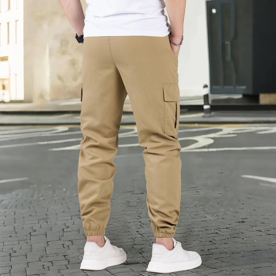 กางเกงคาร์โก้ผู้ชายทรงสลิมฟิตสีดำดีไซน์คล่องตัวเอวยางยืดและผ้ายืดน้ำหนักเบา