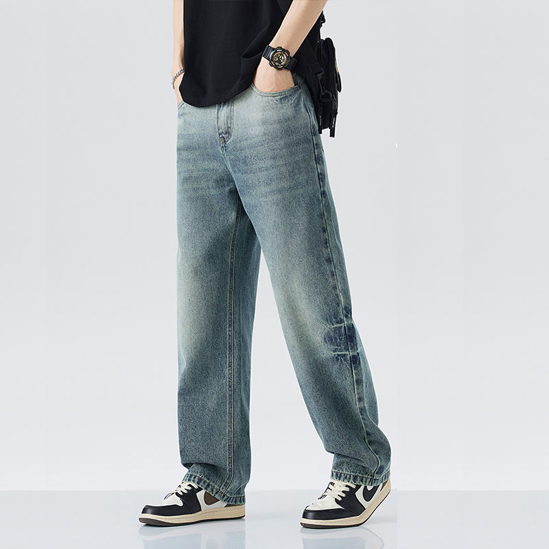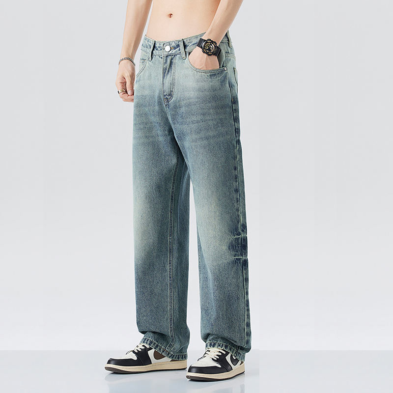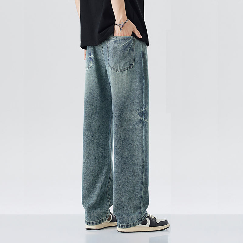 กางเกงยีนส์ขาตรงสไตล์เกาหลีสำหรับผู้ชายขากว้างสไตล์เรโทรเข้าสำหรับฤดูร้อน