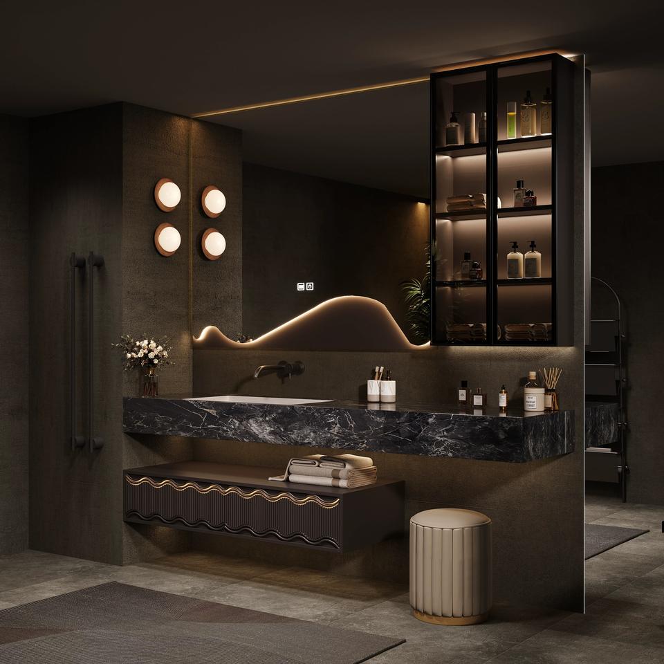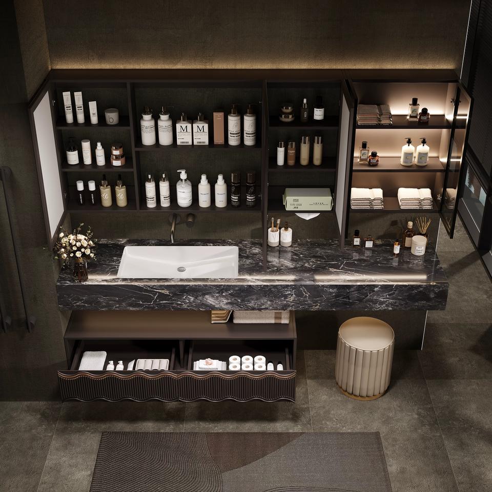 เคาน์เตอร์หินอ่อนสไตล์โมเดิร์นมินิมอลแบบสั่งทำพิเศษ พร้อมตู้ห้องน้ำแบบมีไฟและกระจกอัจฉริยะ