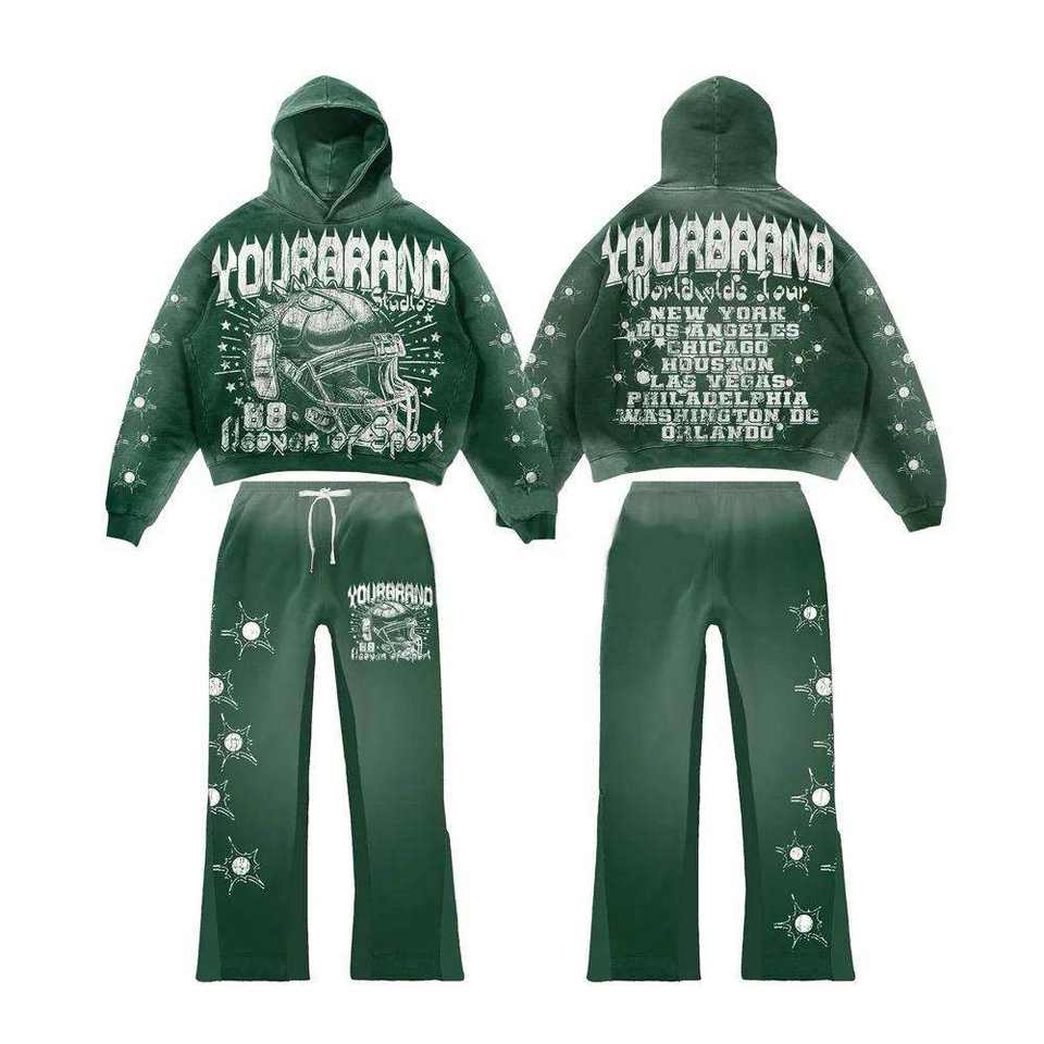 ชุดเซ็ตเสื้อฮู้ดและกางเกงขายาวทรงบานสำหรับผู้ชาย ผ้าฝ้าย 100% พิมพ์ลายวินเทจ สกรีนลายตามสั่ง สำหรับฤดูใบไม้ร่วง เป็นมิตรกับสิ่งแวดล้อม