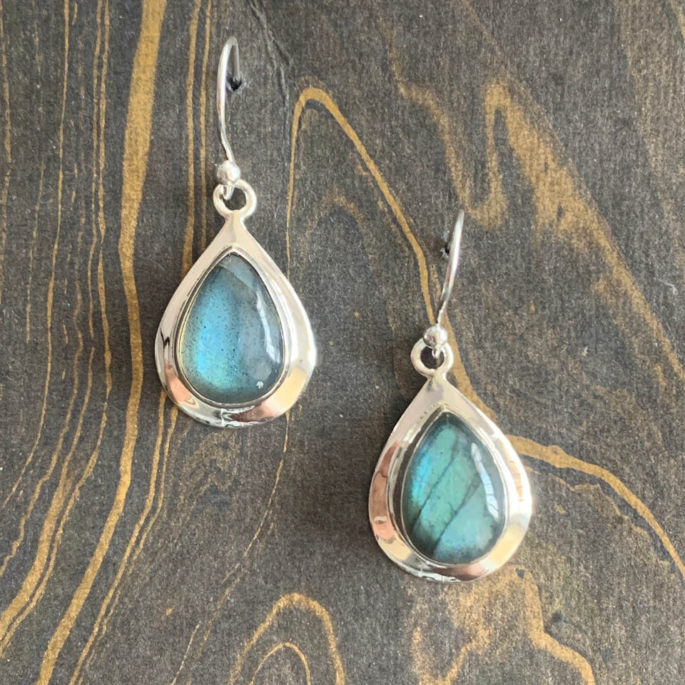 ต่างหูห้อยทรงหยดน้ำประดับลาบราโดไรต์ชุบทอง 18K น่ารัก (5.4 กรัม) ดีไซน์แบบโคมระย้า ลายดอกไม้ประดับมุกและโกเมน