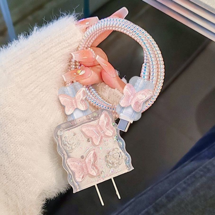 เคสป้องกันสาย USB แวววาวลายดอกทิวลิปโลหะ3D น่ารักสำหรับโทรศัพท์15 14 13 18W-20W สายดาต้าแบบกัดหัวเคสชาร์จเร็ว