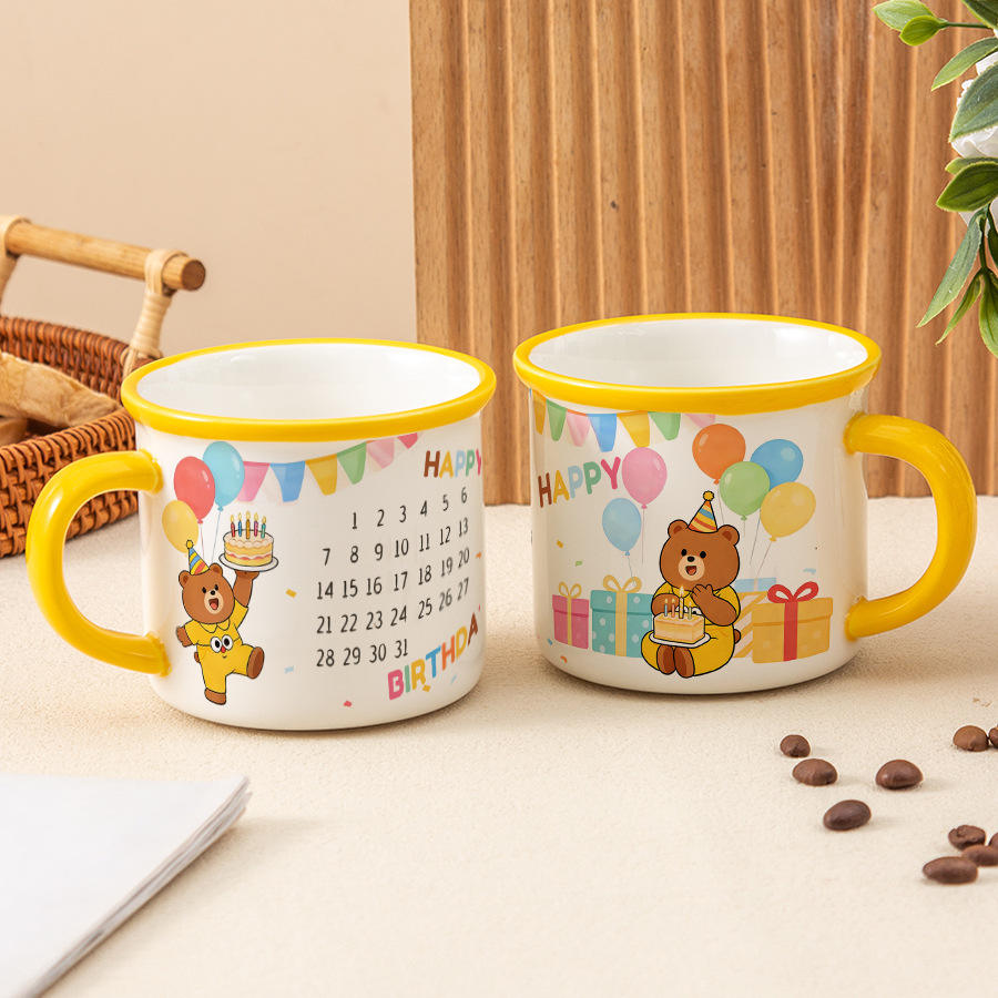 แก้วเซรามิคลายการ์ตูนหมีน่ารัก พร้อมดีไซน์ปฏิทินวันเกิด หูจับสีเหลือง แก้วของขวัญสำหรับงานปาร์ตี้ สำหรับเด็กและผู้ใหญ่