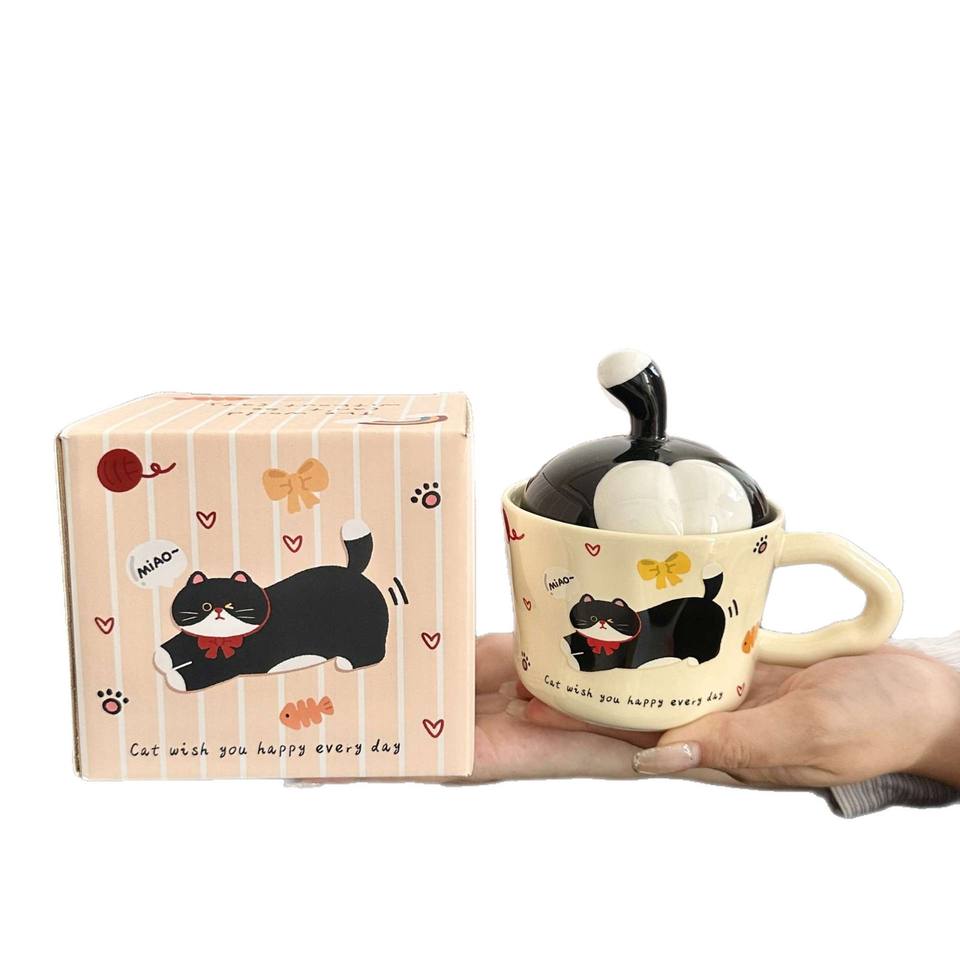แก้วเซรามิคลายหางแมวการ์ตูนน่ารัก พร้อมฝาและหูจับ สำหรับกาแฟ นม ของขวัญสำหรับผู้หญิง ใช้ในออฟฟิศ