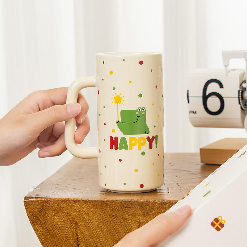 แก้วเซรามิคลายการ์ตูนน่ารักสำหรับเด็กพร้อมหูจับ ความจุขนาดใหญ่ แก้วพอร์ซเลนทรงตรง ดีไซน์ชิ้นเดียว