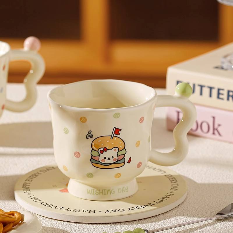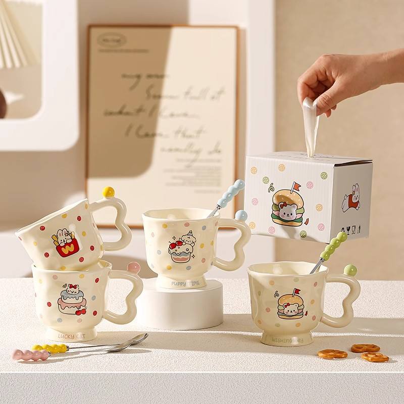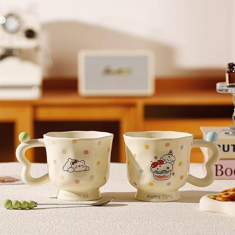 แก้วเซรามิคลายการ์ตูนน่ารักพร้อมหูจับและช้อน แก้วเดี่ยวสำหรับเด็กผู้หญิง ของขวัญวันเกิด ลายลูกสุนัข