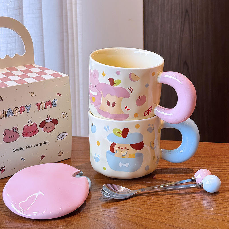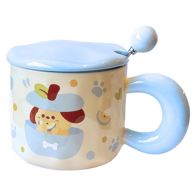 แก้วเซรามิคลายการ์ตูนน่ารักพร้อมฝาและช้อน ลายลูกสุนัขสีฟ้า สำหรับเป็นของขวัญ ฤดูใบไม้ผลิ 2025